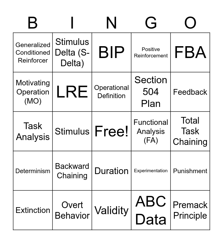 This bingo card has a free space and 60 words: Behavior, Overt Behavior, Covert Behavior, Determinism, ABC Data, In Loco Parentis, LRE, IEP, Section 504 Plan, Manifestation Determination, Positive Reinforcement, Negative Reinforcement, Motivating Operation (MO), Conditioned Reinforcer, Unconditioned Reinforcer, Generalized Conditioned Reinforcer, Premack Principle, FBA, SEAT, Operational Definition, Functional Analysis (FA), BIP, Extinction, Punishment, BST, Instructions, Modeling, Rehearsal, Feedback, Mastery Criteria, Shaping, Differential Reinforcement, Topography, Discriminative Stimulus (SD), Stimulus Delta (S-Delta), Prompt Response, Prompt, Stimulus, Prompt Fading, Task Analysis, Forward Chaining, Backward Chaining, Total Task Chaining, Empiricism, Experimentation, Replication, Parsimony, Philosophic Doubt, Dead Man Test, Duration, Validity, Reliability, Accuracy, Reversal (A-B-A) Design, Multiple Baseline Design, Multielement Design, Changing Criterion Design, Inclusion, Pairing and Group Contingency.