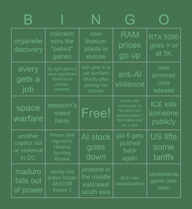 This bingo card has a free space and 24 words: Peace deal signed in Ukraine favoring Russia, disney live action frozen AND/OR frozen 3, ash gets in a car accident shortly after getting her license, maduro falls out of power, RTX 5090 goes > or at 5K, organelle discovery, avery gets a job, colorado wins the "patriot" games, south park comments on the tech ceo assassination / fabricates one as a joke, AI stock goes down, anti-AI violence, space warfare, gta 6 gets pushed back again, US lifts some tariffs, far right gains a more significant foothold in europe; protests, tech ceo assassination, ICE kills someone publicly, new thorium plants in europe, new armored core release, assassin's creed hexe, borderlands game (late year), another capitol riot or violence in DC, RAM prices go up and protests in the middle east/west south asia.