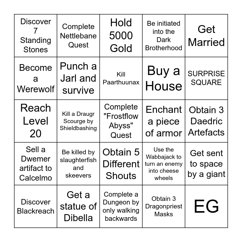This bingo card has 26 words: Obtain 5 Different Shouts, Obtain 3 Dragonpriest Masks, Kill Paarthuunax, Get a statue of Dibella, Get Married, Discover 7 Standing Stones, Become a Werewolf, Complete Nettlebane Quest, Obtain 3 Daedric Artefacts, Use the Wabbajack to turn an enemy into cheese wheels, Buy a House, Reach Level 20, Get sent to space by a giant, Discover Blackreach, Kill a Draugr Scourge by Shieldbashing, Visit all 9 Major Cities, Be initiated into the Dark Brotherhood, Sell a Dwemer artifact to Calcelmo, Hold 5000 Gold, Complete "Frostflow Abyss" Quest, SURPRISE SQUARE, Complete a Dungeon by only walking backwards, Enchant a piece of armor, Be killed by slaughterfish and skeevers, Punch a Jarl and survive and EG.