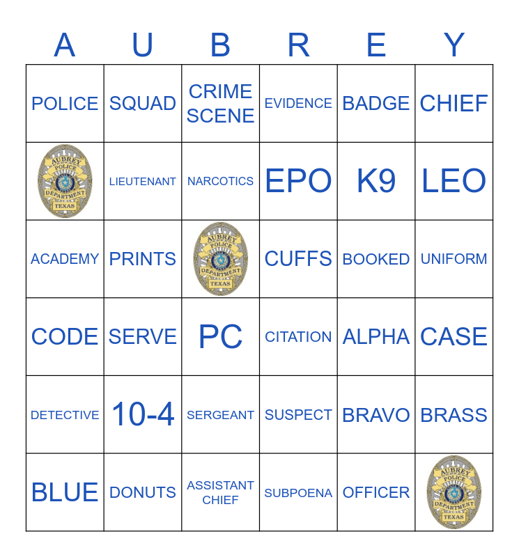 This bingo card has 3 images and 39 words: OFFICER, LIEUTENANT, CRASH, BOOKED, CASE, SERVE, ACADEMY, WARNING, CRIME SCENE, UNIFORM, EPO, LEO, BADGE, DONUTS, CODE, BRASS, K9, SQUAD, CHIEF, SERGEANT, DETECTIVE, POLICE, LAW, BLUE, NARCOTICS, ARREST, 10-4, BRAVO, WARRANT, CUFFS, ALPHA, ASSISTANT CHIEF, PC, CITATION, PRINTS, SUSPECT, SUBPOENA, EVIDENCE and FTO.