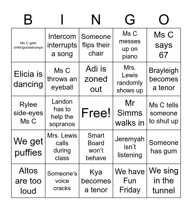 This bingo card has a free space and 55 words: Elicia belches in the middle of rehearsal, Altos are too loud, “Big Strong Man”, Ms C gets chills/goosebumps, Kya becomes a tenor, “Change your schedule”, Ms C throws an eyeball, “Story time”, Mrs. Lewis randomly shows up, Someone leaves early (not sports), Ms C messes up on piano, Someone is on the Wall of Shame, Someone has food in rehearsal, Someone doesn’t have a pencil, Ms C says something is stupid, We completely screw up a warmup, Ms C says 67, Landon has to help the sopranos, Ms C crashes out, We sing in the tunnel, Mr Simms walks in, HS comes over, Jeremyah isn’t listening, Someone flips their chair, Ms C kicks someone in the shins, Adi is zoned out, We have Fun Friday, Ms C tells the baritones to stop touching each other, Ms C tells someone to shut up, Someone has gum, The door slams, We sing the first pitch wrong, C gets chills, Mrs. Lewis comes in, Elicia is dancing, Rylee side-eyes Ms C, Kaleb gets roasted by Ms C, We get puffies, We sing the right dynamic, Ms C is mad because of 6th hour, Intercom interrupts a song, Lilli gives Ms C attitude, Story Time, Tyler Skiles walks in, Mrs. Lewis calls during class, Someone’s voice cracks, Braxton back-sasses Ms. C, Ms. C sings Hamilton songs, Elicia becomes a tenor, Brayleigh becomes a tenor, Someone doesn’t have a pencil for sectionals, Band director walks in, Everyone has a pencil!, Smart Board won’t behave and Ms C throws something.