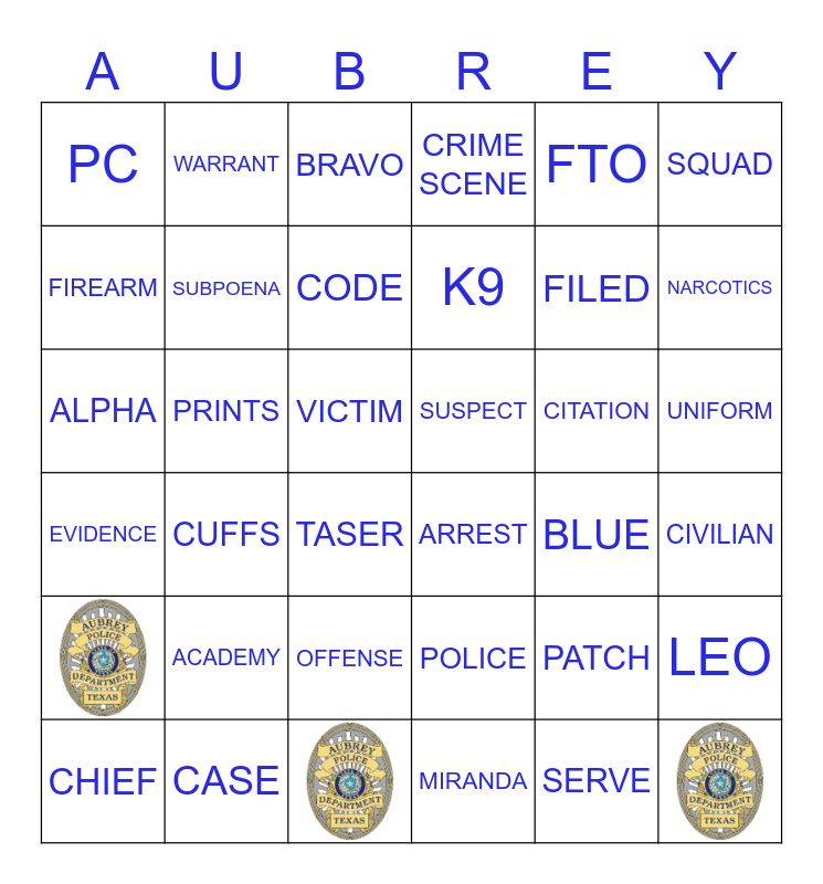 This bingo card has 3 images and 33 words: POLICE, OFFENSE, MIRANDA, FIREARM, EVIDENCE, SUSPECT, SUBPOENA, FTO, PATCH, NARCOTICS, CRIME SCENE, LEO, PRINTS, K9, PC, CITATION, ALPHA, BRAVO, VICTIM, CUFFS, ARREST, TASER, BLUE, WARRANT, FILED, CASE, CODE, SQUAD, CHIEF, CIVILIAN, UNIFORM, ACADEMY and SERVE.