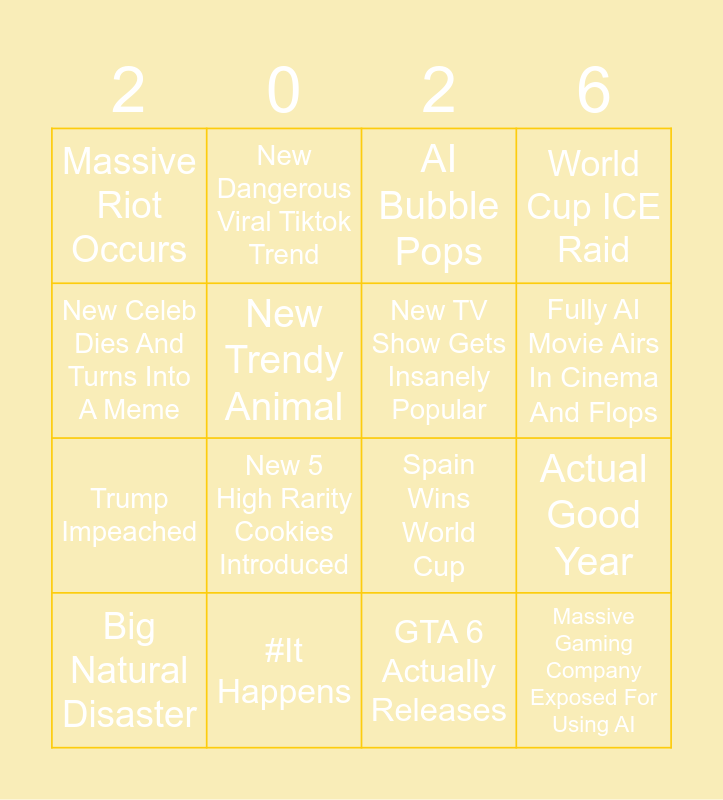 This bingo card has 16 words: #It Happens, Actual Good Year, AI Bubble Pops, Massive Riot Occurs, Trump Impeached, New Dangerous Viral Tiktok Trend, Spain Wins World Cup, GTA 6 Actually Releases, New Celeb Dies And Turns Into A Meme, New Trendy Animal, Big Natural Disaster, World Cup ICE Raid, New 5 High Rarity Cookies Introduced, Fully AI Movie Airs In Cinema And Flops, New TV Show Gets Insanely Popular and Massive Gaming Company Exposed For Using AI.