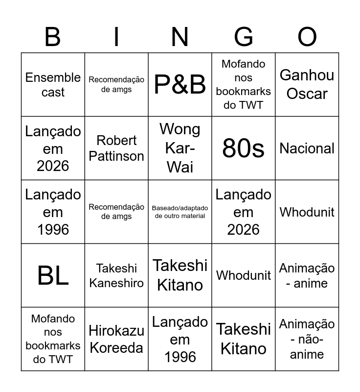 This bingo card has 41 words: Animação, Lançado em 1996, 80s, Robert Pattinson, Hirokazu Koreeda, Takeshi Kitano, Wong Kar-Wai, Nacional, Ganhou Oscar, BL, Recomendação de amgs, Mofando nos bookmarks do TWT, Baseado/adaptado de outro material, Whodunit, Lançado em 2026, Takeshi Kaneshiro, Road trip, Ensemble cast, Park Chanwook, P&B, Animação - anime, Animação - não-anime, Lançado em 1996, 80s, Robert Pattinson, Hirokazu Koreeda, Takeshi Kitano, Wong Kar-Wai, Nacional, Ganhou Oscar, BL, Recomendação de amgs, Mofando nos bookmarks do TWT, Baseado/adaptado de outro material, Whodunit, Lançado em 2026, Takeshi Kaneshiro, Road trip, Ensemble cast, Park Chanwook and P&B.