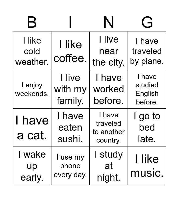 This bingo card has 28 words: Free!, I have a dog., I have a cat., I have brothers or sisters., I live with my family., I live near the city., I like coffee., I like music., I use my phone every day., I watch TV at night., I have traveled to another country., I have traveled by plane., I have visited the beach., I have visited the mountains., I have eaten sushi., I have tried typical food., I have lived in another city., I have worked before., I have studied English before., I like pizza., I like cold weather., I prefer tea., I wake up early., I go to bed late., I study at night., I work on weekdays., I enjoy weekends. and I listen to music every day..