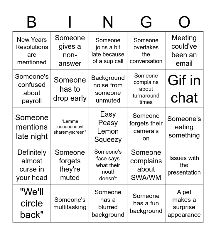 This bingo card has a free space and 29 words: "We'll circle back", Something gets takeaway'd, "Lemme juuuuuuuuust sharemyscreen", "Can y'all see my screen?", New Years Resolutions are mentioned, Someone joins a bit late because of a sup call, Someone has to drop early, Someone forgets they're muted, Someone forgets their camera's on, Someone's multitasking, Someone's eating something, A pet makes a surprise appearance, Someone has a blurred background, Someone has a fun background, Gif in chat, Had to check to be sure you're muted, Someone's face says what their mouth doesn't, Definitely almost curse in your head, Meeting could've been an email, Someone mentions late night, Someone complains about SWA/WM, Someone mentions an HR case, Someone complains about turnaround times, Someone's confused about payroll, Someone overtakes the conversation, Someone gives a non-answer, Issues with the presentation, Background noise from someone unmuted and Something major everyone knows still isn't announced.