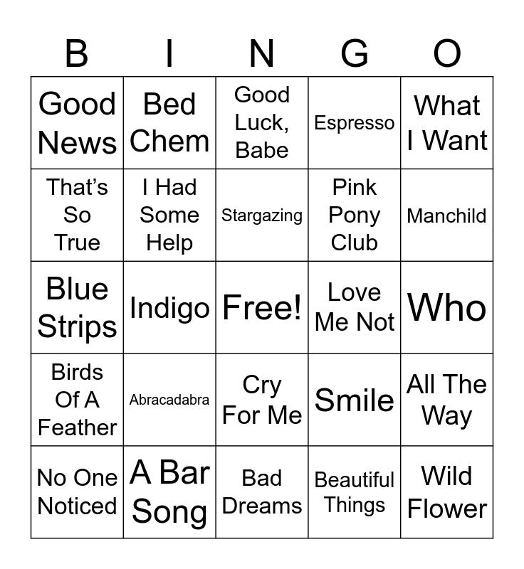 This bingo card has a free space and 60 words: Die With A Smile, A Bar Song, Lose Control, Birds Of A Feather, Beautiful Things, Ordinary, I Had Some Help, APT., Pink Pony Club, Love Somebody, Espresso, I’m The Problem, That’s So True, Just In Case, Taste, Good News, Wild Flower, What I Want, Messy, Stargazing, Love Me Not, Good Luck, Babe, No One Noticed, All The Way, Too Sweet, Worst Way, Sailor Song, Sorry I’m Here For Someone Else, Manchild, Anxiety, I Got Better, Undressed, I Never Lie, Back To Friends, Bed Chem, Sports Car, Mystical Magical, Indigo, Please Please Please, Blue Strips, High Road, Abracadabra, Who, Daises, Smile, Am I Okay?, Happen To Me, Weren’t For The Wind, I Ain’t Comin Back, Cry For Me, Bad Dreams, I’m Gonna Love You, I Am Not Okay, Backup Plan, Revolving Door, Hard Fought Hallelujah, Liar, After All the Bars Are Closed, 20 Cigarettes and Heart Of A Woman.