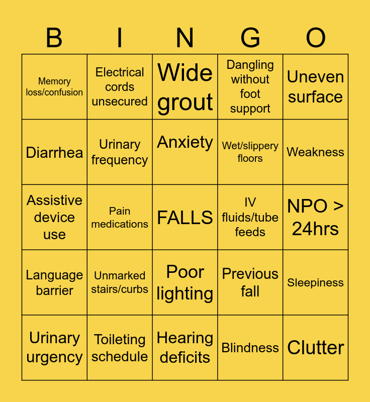 This bingo card has a free space and 42 words: Poor balance, Anxiety, Uses braces/splints, Unmarked stairs/curbs, Blindness, Sleepiness, Clutter, Hemiplegia, Wide grout, Poor lighting, NPO > 24hrs, Weakness, Pain medications, Uneven surface, Unable to comply, Previous fall, Bed alarms, Assistive device use, Gait belt, Electrical cords unsecured, Diarrhea, Patient education, Clear pathways, Memory loss/confusion, Impulsiveness, Wait a few seconds to stand, Wet/slippery floors, Hourly rounding, Ensure pathways are clear, Bed in low position, Neuropathy, Language barrier, Urinary frequency, Hearing deficits, Throw rugs, Urinary urgency, Toileting schedule, IV fluids/tube feeds, Nausea, Alone in the bathroom, Dangling without foot support and Gait belt.