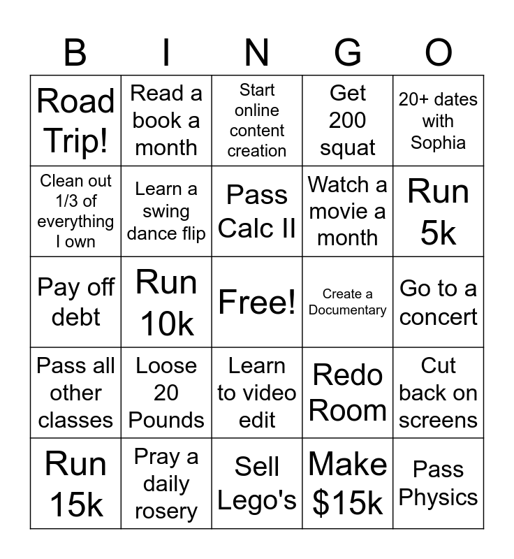 This bingo card has a free space and 24 words: Loose 20 Pounds, Pray a daily rosery, Pass Calc II, Run 15k, 20+ dates with Sophia, Road Trip!, Clean out 1/3 of everything I own, Read a book a month, Create a Documentary, Learn to video edit, Watch a movie a month, Pay off debt, Redo Room, Cut back on screens, Learn a swing dance flip, Make $15k, Go to a concert, Start online content creation, Run 5k, Run 10k, Pass Physics, Pass all other classes, Get 200 squat and Sell Lego's.