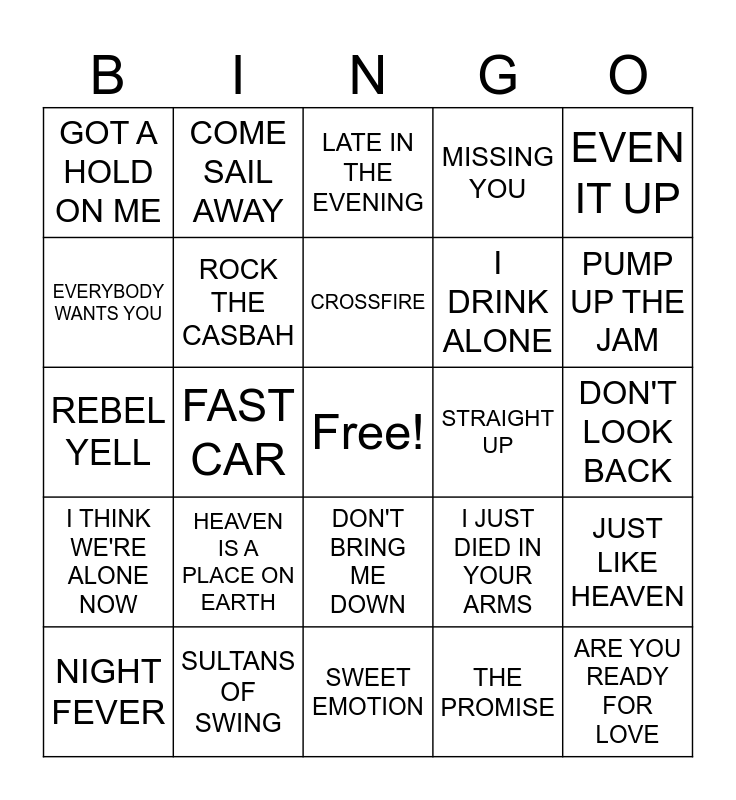 This bingo card has a free space and 68 words: ALL OUT OF LOVE, ARE YOU READY FOR LOVE, BORN TO RUN, BROKEN WINGS, BURNIN FOR YOU, CALL ME, COME SAIL AWAY, CRAZY TRAIN, CROSSFIRE, CULT OF PERSONALITY, DON'T BRING ME DOWN, DON'T DREAM IT'S OVER, DON'T LOOK BACK, EVEN IT UP, EVERY BREATH YOU TAKE, EVERYBODY WANTS YOU, FAST CAR, GOT A HOLD ON ME, HARDEN MY HEART, HEAVEN IS A PLACE ON EARTH, I DRINK ALONE, I JUST DIED IN YOUR ARMS, I THINK WE'RE ALONE NOW, IF YOU LEAVE, I'M ALL OUT OF LOVE, I'M SO EXCITED, IT TAKES TWO, JUMPIN' JACK FLASH, JUST LIKE HEAVEN, KARMA CHAMELEON, LATE IN THE EVENING, LET'S GROOVE, LOVE SONG, MANIC MONDAY, MISSING YOU, MISSISSIPPI QUEEN, MY KINDA LOVER, NIGHT FEVER, PUMP UP THE JAM, REBEL YELL, REVOLUTION, RIO, ROCK THE CASBAH, SHATTERED DREAMS, SMOOTH OPERATOR, SPIRIT OF RADIO, STAND BACK, STRAIGHT INTO DARKNESS, STRAIGHT UP, SULTANS OF SWING, SUNGLASSES AT NIGHT, SUPER TROOPER, SWEET DREAMS, SWEET EMOTION, SYMPATHY FOR THE DEVIL, TALK TO YOU LATER, THE PROMISE, THE RIGHT STUFF, TURN UP THE RADIO, UPTOWN GIRL, WHAT'S LOVE GOT TO DO WITH IT, WHEEL IN THE SKY, WHILE YOU SEE A CHANCE, WILD THING, WINNING, YOUNG TURKS, YOUR LOVE and YOU'VE GOT ANOTHER THING COMIN'.