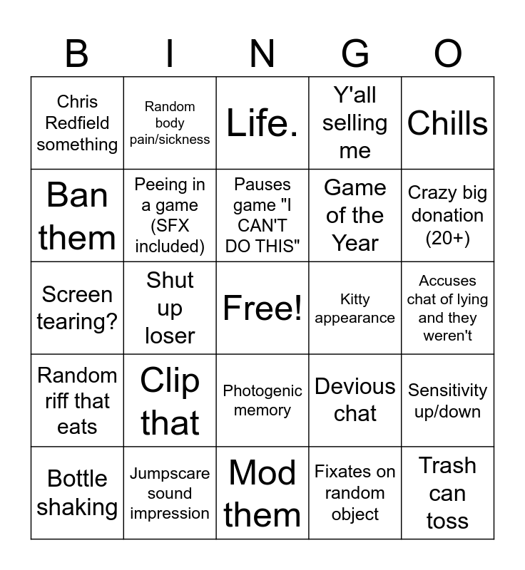 This bingo card has a free space and 27 words: Devious chat, Gamer Supps Plug, Game of the Year, Mod them, Ban them, Life., Random body pain/sickness, Random riff that eats, Kitty appearance, Sensitivity up/down, Screen tearing?, Y'all selling me, Bottle shaking, Jumpscare sound impression, Crazy big donation (20+), Teleporting from the bathroom, Peeing in a game (SFX included), Pauses game "I CAN'T DO THIS", Clip that, Chris Redfield something, Accuses chat of lying and they weren't, Fixates on random object, Shut up loser, Trash can toss, Photogenic memory, Chills and Always go left.