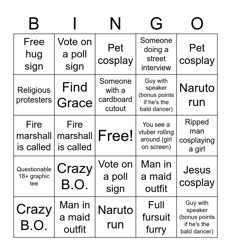 ⚠ This card has duplicate items: Free hug sign (2), Guy with speaker (bonus points if he's the bald dancer) (2), 10+ person cosplay group (2), Naruto run (2), Crazy B.O. (2), Slap/Step on you for $$ sign (2), Vote on a poll sign (2), Questionable 18+ graphic tee (2), Religious protesters (2), Get 5 ribbons (2), Find Grace (2), Someone doing a street interview (2), Jesus cosplay (2), Man in a maid outfit (2), Ripped man cosplaying a girl (2), Someone with a body pillow (2), Someone with a cardboard cutout (2), You see a vtuber rolling around (girl on screen) (2), Family cosplay (2), Pet cosplay (2), Fire marshall is called (2), Full fursuit furry (2)