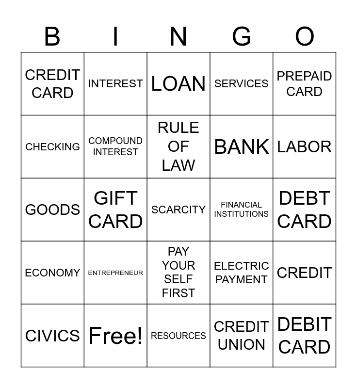 This bingo card has 28 words: CREDIT, SAVING, BANK, CREDIT UNION, CHECKING, LOAN, INTEREST, ECONOMY, FINANCIAL INSTITUTIONS, CIVICS, GOODS, SERVICES, Free!, RESOURCES, LABOR, CONSUMER, ENTREPRENEUR, COMPOUND INTEREST, RULE OF LAW, PAY YOUR SELF FIRST, CREDIT CARD, DEBIT CARD, SCARCITY, GIFT CARD, DEBT CARD, ELECTRIC PAYMENT, PREPAID CARD and PIN.