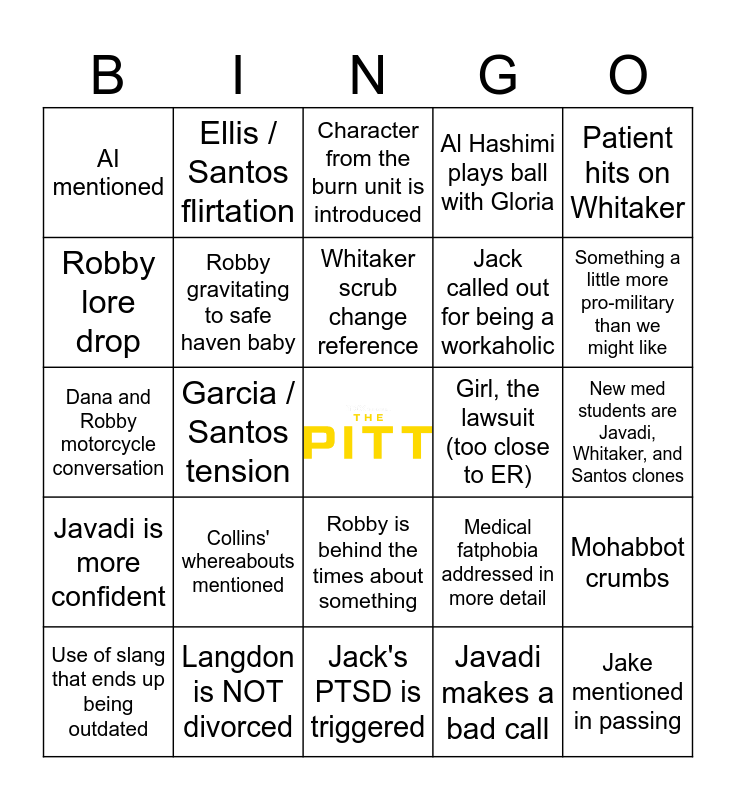 This bingo card has a free space and 44 words: Patient gets through to Robby emotionally, Jake mentioned in passing, Santos or Whitaker accidentally spills the other's tea, Use of slang that ends up being outdated, Couple gets into a fight in the ED, Javadi makes a bad call, Character from the burn unit is introduced, Medicaid cuts mentioned, Patient hits on Whitaker, Langdon is NOT divorced, Al Hashimi plays ball with Gloria, Girl, the lawsuit (too close to ER), Robby is behind the times about something, Collins' whereabouts mentioned, Mohan stands up to Robby, Jack's PTSD is triggered, Langdon humbles Robby, but respectfully, Dana and Robby motorcycle conversation, Myrna is a major case, Something a little more pro-military than we might like, Ellis / Santos flirtation, Improved bedside manner from Javadi, HR violation, AI mentioned, Myrna is absent from the show :/, New med students are Javadi, Whitaker, and Santos clones, Reflection on patriotism, They make reference to McKay's lack of ankle monitor, Medical fatphobia addressed in more detail, Javadi is more confident, Langdon avoids Santos, Mohabbot crumbs, Sincere moment between Robby and Mohan, Openly bigoted patient, Garcia / Santos tension, Micro trend spotted, Robby mentions an ex (not Janey), Ellis / Santos mentorship, Whitaker scrub change reference, Robby lore drop, Jack called out for being a workaholic, Robby visibly self-soothing after interacting with Langdon, Robby gravitating to safe haven baby and Someone compliments Javadi's dyed hair.