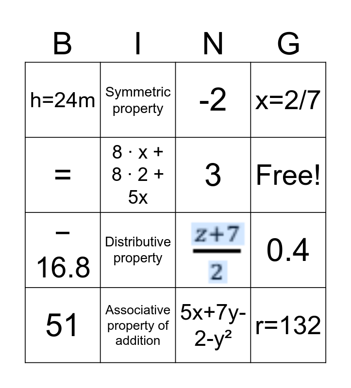 This bingo card has 1 images and 17 words: Distributive property, r=132, -2, h=24m, x=2/7, 51, Symmetric property, Free!, − 16.8, 5x+7y-2-y², =, 0.4, 8 ∙ x + 8 ∙ 2 + 5x, 3, N/10-6=24, Associative property of addition and Commutative property of addition.