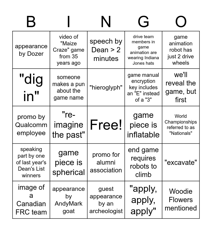 This bingo card has a free space and 29 words: image of a Canadian FRC team, advertisement for Haas, "re-imagine the past", safety animation winner, appearance by Dozer, speech by Dean > 2 minutes, someone makes a pun about the game name, game piece is spherical, game piece is inflatable, appearance by AndyMark goat, World Championships referred to as "Nationals", Woodie Flowers mentioned, guest appearance by an archeologist, "apply, apply, apply", we'll reveal the game, but first, commercial for Space Force, promo for alumni association, speaking part by one of last year's Dean's List winners, game animation robot has just 2 drive wheels, promo by Qualcomm employee, end game requires robots to climb, totes make up part of the playing field, game manual encryption key includes an "E" instead of a "3", "dig in", drive team members in game animation are wearing Indiana Jones hats, video of "Maize Craze" game from 35 years ago, "excavate", "hieroglyph" and "Antikythera Mechanism".