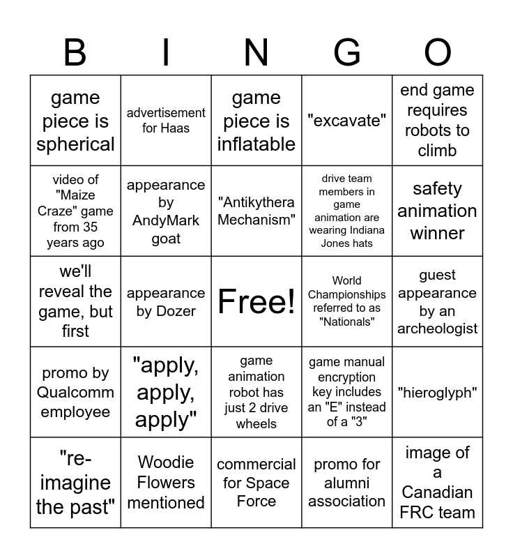 This bingo card has a free space and 29 words: "re-imagine the past", totes make up part of the playing field, appearance by Dozer, speech by Dean > 2 minutes, game piece is spherical, game piece is inflatable, appearance by AndyMark goat, "apply, apply, apply", World Championships referred to as "Nationals", Woodie Flowers mentioned, guest appearance by an archeologist, image of a Canadian FRC team, commercial for Space Force, promo for alumni association, safety animation winner, speaking part by one of last year's Dean's List winners, game animation robot has just 2 drive wheels, promo by Qualcomm employee, end game requires robots to climb, we'll reveal the game, but first, game manual encryption key includes an "E" instead of a "3", "dig in", drive team members in game animation are wearing Indiana Jones hats, video of "Maize Craze" game from 35 years ago, "excavate", advertisement for Haas, "hieroglyph", "Antikythera Mechanism" and someone makes a pun about the game name.