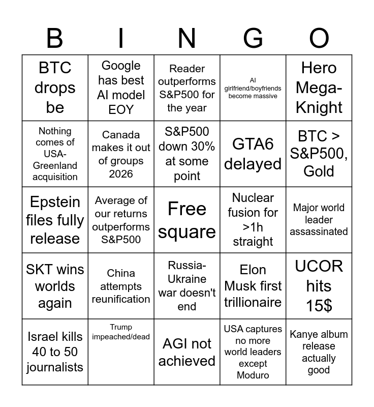 This bingo card has a free space and 24 words: China attempts reunification, Trump impeached/dead, S&P500 down 30% at some point, Israel kills 40 to 50 journalists, Hero Mega-Knight, BTC drops be, Nothing comes of USA-Greenland acquisition, Google has best AI model EOY, Nuclear fusion for >1h straight, Russia-Ukraine war doesn't end, GTA6 delayed, Epstein files fully release, Elon Musk first trillionaire, UCOR hits 15$, Canada makes it out of groups 2026, USA captures no more world leaders except Moduro, Major world leader assassinated, Reader outperforms S&P500 for the year, BTC > S&P500, Gold, Average of our returns outperforms S&P500, Kanye album release actually good, SKT wins worlds again, AI girlfriend/boyfriends become massive and AGI not achieved.