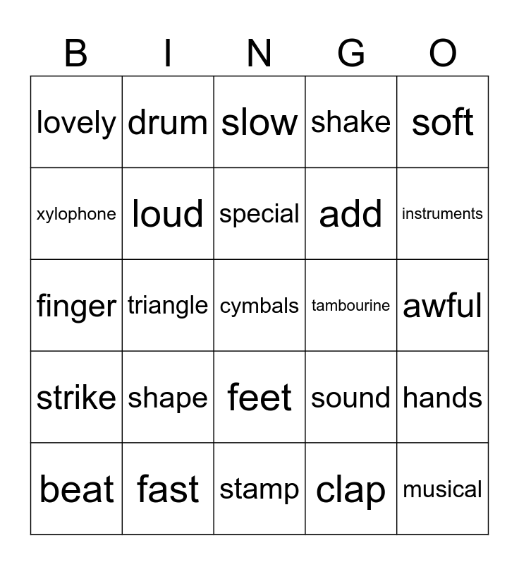 This bingo card has 25 words: strike, fast, cymbals, clap, soft, lovely, drum, slow, tambourine, hands, xylophone, loud, stamp, sound, instruments, beat, triangle, special, add, awful, finger, shape, feet, shake and musical.