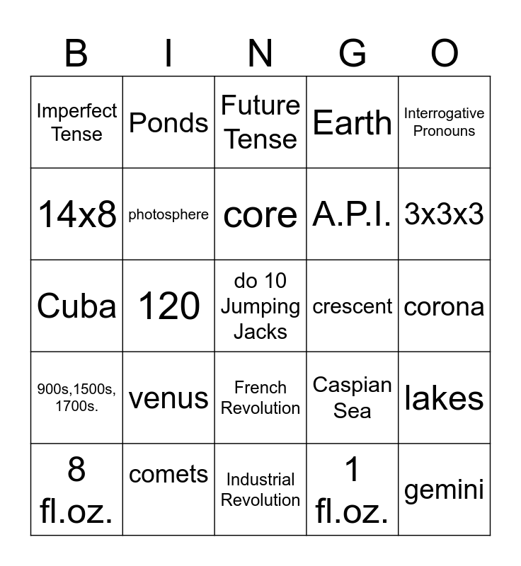 This bingo card has a free space and 29 words: 8 fl.oz., Haiti, 120, Black sea, Imperfect Tense, Future Tense, photosphere, venus, crescent, comets, corona, gemini, Industrial Revolution, 1 fl.oz., 3x3x3, 15x15, French Revolution, 900s,1500s, 1700s., Interrogative Pronouns, Cuba, Caspian Sea, timeline, A.P.I., 14x8, Earth, Ponds, lakes, core and themselves.