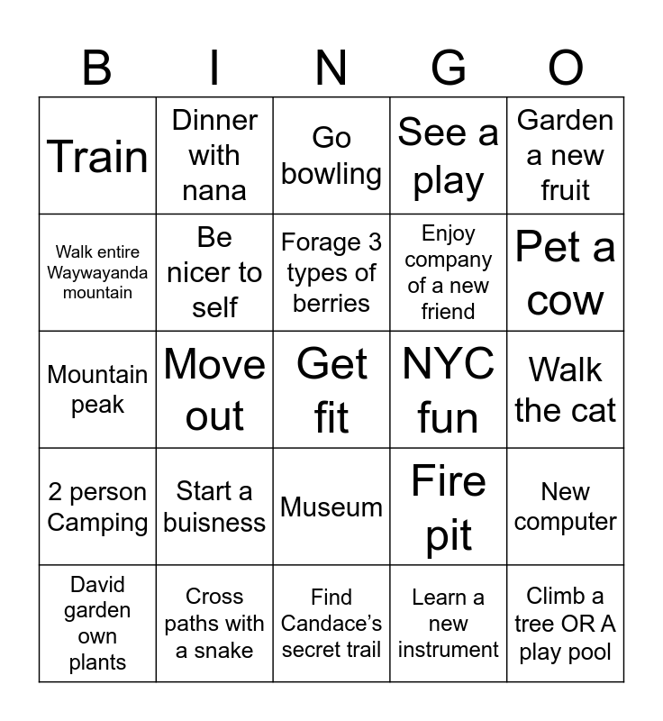 This bingo card has a free space and 30 words: Cross paths with a snake, Leave on a Saturday, return on Tuesday, Move out, Big vacation, Train, Go bowling, Be nicer to self, Museum, NYC fun, Find Candace’s secret trail, Walk the cat, Climb a tree OR A play pool, Learn a new instrument, See a large Wild feline, Pet a cow, Save $5,000, Fire pit, 2 person Camping, Start a buisness, Garden a new fruit, Mountain peak, try a new sport, Dinner with nana, Enjoy company of a new friend, Walk entire Waywayanda mountain, See a play, New computer, David garden own plants, Forage 3 types of berries and Get the flu shot.