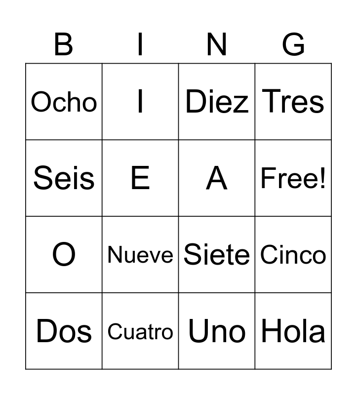 This bingo card has 17 words: Uno, Dos, Diez, Ocho, Nueve, Tres, Cinco, A, Free!, E, Cuatro, Siete, Seis, I, O, U and Hola.