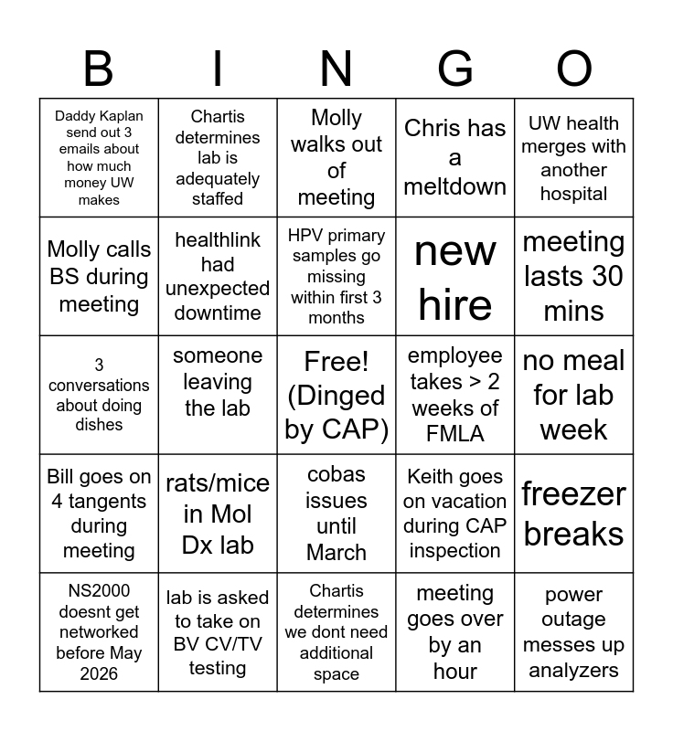 This bingo card has a free space and 24 words: rats/mice in Mol Dx lab, lab is asked to take on BV CV/TV testing, HPV primary samples go missing within first 3 months, NS2000 doesnt get networked before May 2026, UW health merges with another hospital, Daddy Kaplan send out 3 emails about how much money UW makes, Molly calls BS during meeting, Chartis determines lab is adequately staffed, employee takes > 2 weeks of FMLA, cobas issues until March, new hire, 3 conversations about doing dishes, Keith goes on vacation during CAP inspection, freezer breaks, healthlink had unexpected downtime, meeting goes over by an hour, no meal for lab week, Molly walks out of meeting, meeting lasts 30 mins, someone leaving the lab, power outage messes up analyzers, Bill goes on 4 tangents during meeting, Chris has a meltdown and Chartis determines we dont need additional space.