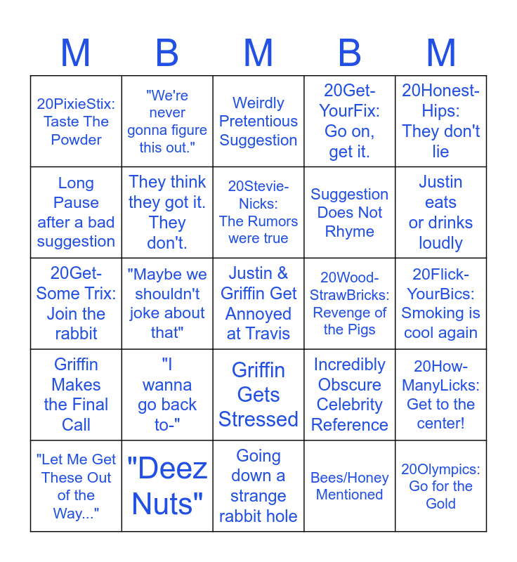 This bingo card has a free space and 24 words: "I wanna go back to-", "Deez Nuts", 20Stevie-Nicks: The Rumors were true, "Let Me Get These Out of the Way...", 20Honest-Hips: They don't lie, 20PixieStix: Taste The Powder, Long Pause after a bad suggestion, "We're never gonna figure this out.", 20Wood-StrawBricks: Revenge of the Pigs, Griffin Gets Stressed, Suggestion Does Not Rhyme, 20Get- Some Trix: Join the rabbit, Incredibly Obscure Celebrity Reference, 20How-ManyLicks: Get to the center!, They think they got it. They don't., Bees/Honey Mentioned, 20Flick-YourBics: Smoking is cool again, Weirdly Pretentious Suggestion, Justin eats or drinks loudly, "Maybe we shouldn't joke about that", 20Olympics: Go for the Gold, Griffin Makes the Final Call, 20Get-YourFix: Go on, get it. and Going down a strange rabbit hole.