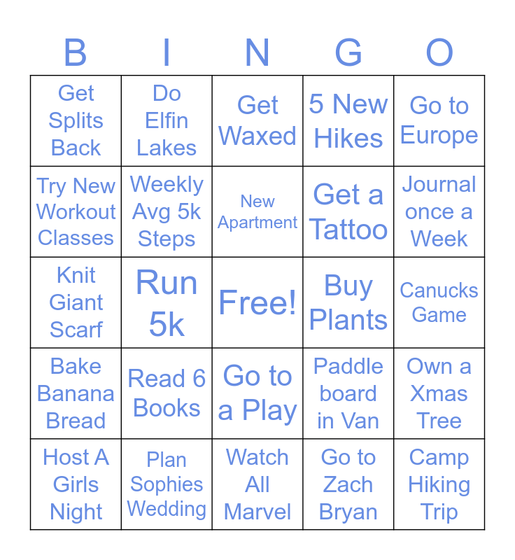 This bingo card has a free space and 24 words: Read 6 Books, Plan Sophies Wedding, New Apartment, Host A Girls Night, Go to Europe, Get Splits Back, Try New Workout Classes, Do Elfin Lakes, Buy Plants, Go to a Play, Get a Tattoo, Knit Giant Scarf, Paddle board in Van, Own a Xmas Tree, Weekly Avg 5k Steps, Go to Zach Bryan, Canucks Game, Get Waxed, Journal once a Week, Run 5k, Camp Hiking Trip, Bake Banana Bread, 5 New Hikes and Watch All Marvel.