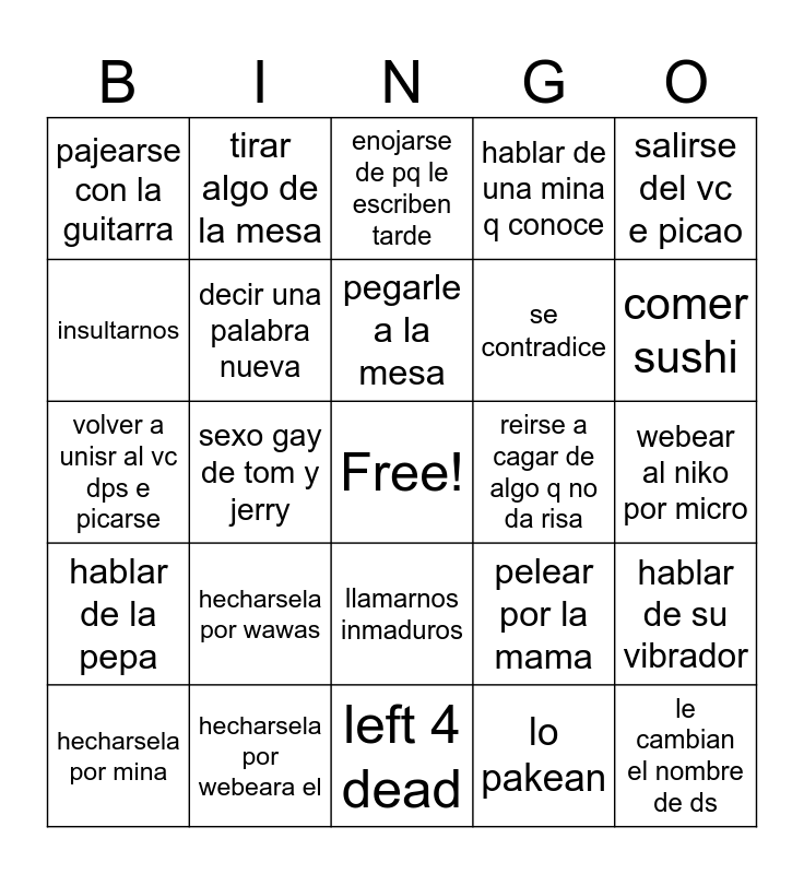 This bingo card has a free space and 24 words: hecharsela por wawas, hecharsela por webeara el, pegarle a la mesa, hecharsela por mina, salirse del vc e picao, pajearse con la guitarra, insultarnos, tirar algo de la mesa, reirse a cagar de algo q no da risa, llamarnos inmaduros, se contradice, volver a unisr al vc dps e picarse, pelear por la mama, hablar de su vibrador, decir una palabra nueva, lo pakean, webear al niko por micro, enojarse de pq le escriben tarde, comer sushi, sexo gay de tom y jerry, le cambian el nombre de ds, hablar de la pepa, hablar de una mina q conoce and left 4 dead.