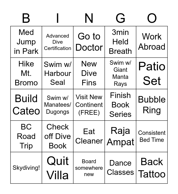This bingo card has a free space and 24 words: Check off Dive Book, Quit Villa, New Dive Fins, Skydiving!, Work Abroad, Med Jump in Park, Hike Mt. Bromo, Advanced Dive Certification, Finish Book Series, Eat Cleaner, Swim w/ Giant Manta Rays, Build Cateo, Raja Ampat, Consistent Bed Time, Swim w/ Harbour Seal, Dance Classes, Bubble Ring, Go to Doctor, Patio Set, Swim w/ Manatees/ Dugongs, Back Tattoo, BC Road Trip, 3min Held Breath and Board somewhere new.