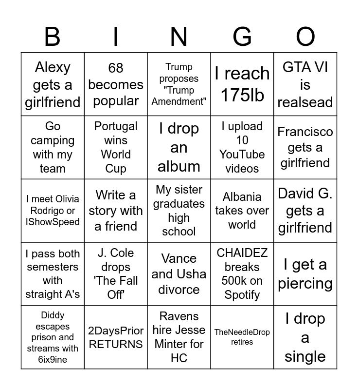 This bingo card has a free space and 24 words: Diddy escapes prison and streams with 6ix9ine, J. Cole drops 'The Fall Off', I drop an album, TheNeedleDrop retires, GTA VI is realsead, Alexy gets a girlfriend, 68 becomes popular, Trump proposes "Trump Amendment", Albania takes over world, David G. gets a girlfriend, I meet Olivia Rodrigo or IShowSpeed, Portugal wins World Cup, CHAIDEZ breaks 500k on Spotify, I get a piercing, Go camping with my team, 2DaysPrior RETURNS, Ravens hire Jesse Minter for HC, I reach 175lb, Francisco gets a girlfriend, I pass both semesters with straight A's, Write a story with a friend, Vance and Usha divorce, I upload 10 YouTube videos and I drop a single.