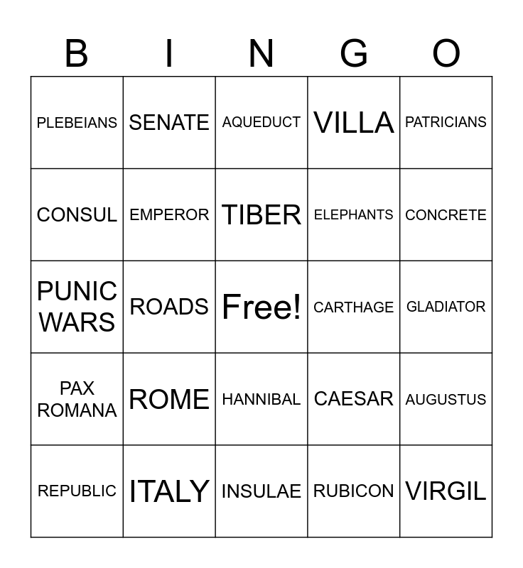 This bingo card has a free space and 24 words: ROME, ITALY, TIBER, REPUBLIC, PATRICIANS, PLEBEIANS, CONSUL, SENATE, CARTHAGE, HANNIBAL, ELEPHANTS, PUNIC WARS, CAESAR, AUGUSTUS, EMPEROR, RUBICON, GLADIATOR, AQUEDUCT, CONCRETE, ROADS, VIRGIL, PAX ROMANA, VILLA and INSULAE.