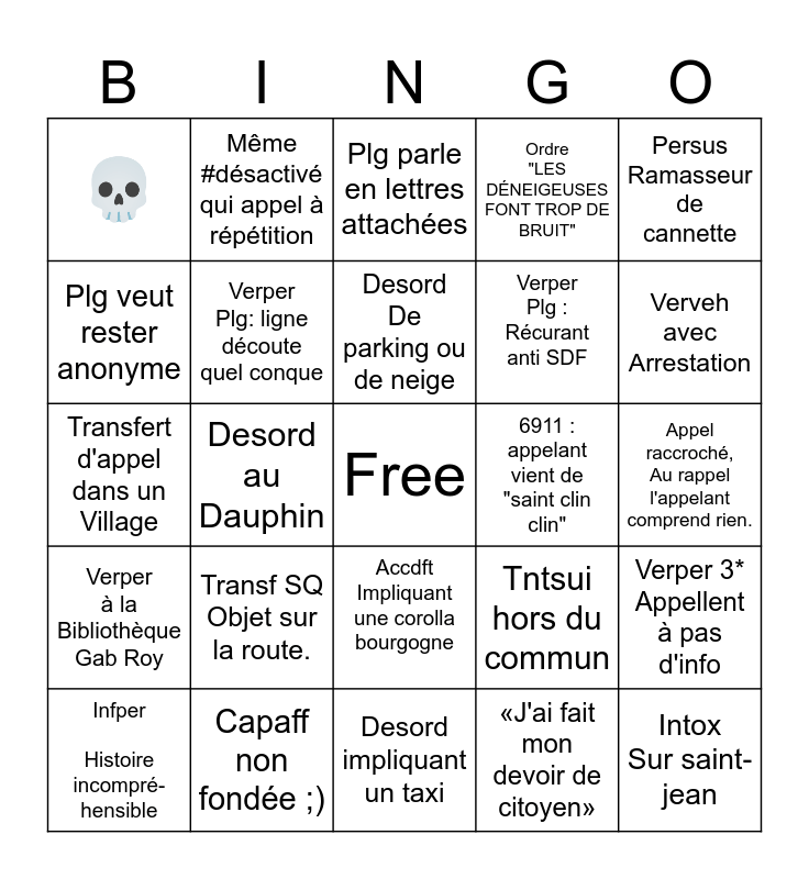 This bingo card has a free space and 29 words: Infper Histoire incompré-hensible, Desord Impliquant enfant entre 8 &13 ans en crise, Desord au Dauphin, Dsocon Capaff Vdft La totale dans le meme EV, 💀, Plg parle en lettres attachées, Verper Plg: ligne découte quel conque, Transf SQ Objet sur la route., 6911 : appelant vient de "saint clin clin", Capaff non fondée ;), Appel raccroché, Au rappel l'appelant comprend rien., Intox Sur saint-jean, Desord impliquant un taxi, «J'ai fait mon devoir de citoyen», Verveh avec Arrestation, Alabar pour cause de batterie, Accdft Impliquant une corolla bourgogne, Verper à la Bibliothèque Gab Roy, Persus Ramasseur de cannette, Transfert d'appel dans un Village, Tntsui hors du commun, Disper Retrouvé, Verper Plg : Récurant anti SDF, Plg veut rester anonyme, Ordre "LES DÉNEIGEUSES FONT TROP DE BRUIT", Même #désactivé qui appel à répétition, Verper 3* Appellent à pas d'info, Desord De parking ou de neige and Ass911 Fondé.