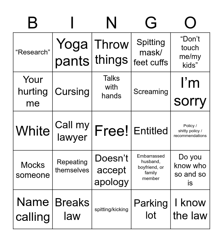 This bingo card has a free space and 34 words: “Shut up?” no no no, Parking lot, Name dropping - “do you know who I am?”, Crazy eyes, Mocks someone, Cursing, “Don’t touch me/my kids”, Name calling, Yoga pants, “Stop recording / are you recording?”, Talks with hands, Throw things, Out of shape, Has kids with her, Entitled, I’m sorry, Breaks law, White, Repeating themselves, Embarrassed husband, boyfriend, or family member, Doesn’t accept apology, Dyed or bleached hair, “Research”, Policy / shitty policy / recommendations, spitting/kicking, I know the law, Spitting mask/ feet cuffs, I know the law, Screaming, Your hurting me, Playing the victim card, Call my lawyer, Do you know who so and so is and You can’t arrest me.