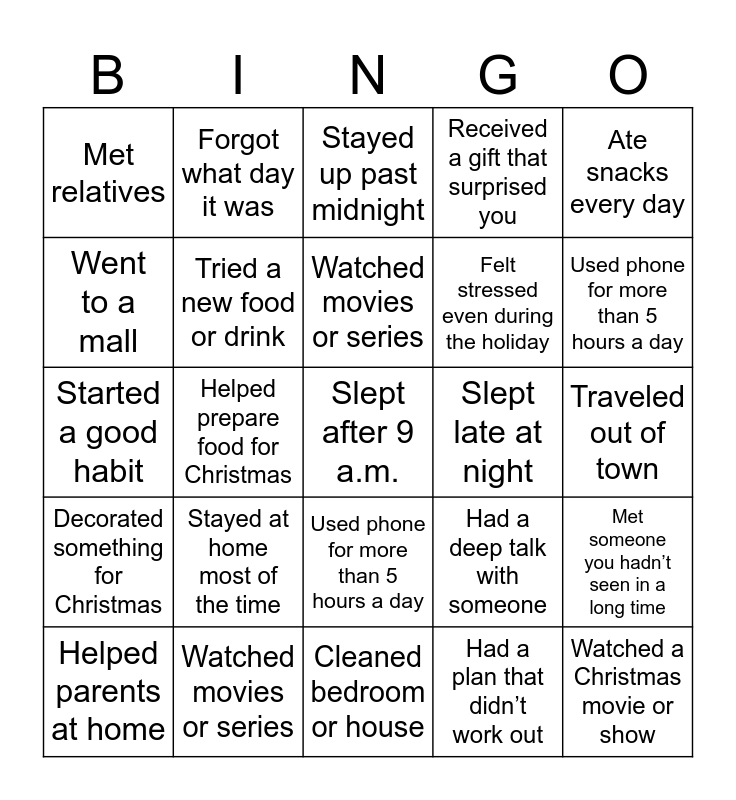 This bingo card has a free space and 24 words: Stayed at home most of the time, Watched movies or series, Watched movies or series, Helped parents at home, Ate snacks every day, Met relatives, Went to a mall, Forgot what day it was, Slept late at night, Used phone for more than 5 hours a day, Felt stressed even during the holiday, Started a good habit, Had a deep talk with someone, Met someone you hadn’t seen in a long time, Tried a new food or drink, Had a plan that didn’t work out, Traveled out of town, Stayed up past midnight, Used phone for more than 5 hours a day, Helped prepare food for Christmas, Watched a Christmas movie or show, Decorated something for Christmas, Received a gift that surprised you and Cleaned bedroom or house.