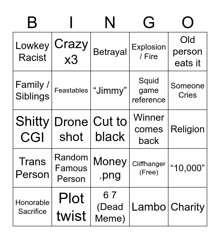 This bingo card has 25 words: Random Famous Person, 6 7 (Dead Meme), “Jimmy”, Honorable Sacrifice, Old person eats it, Lowkey Racist, Family / Siblings, Crazy x3, Winner comes back, Money .png, Squid game reference, Shitty CGI, Cliffhanger (Free), “10,000”, Feastables, Charity, Religion, Betrayal, Someone Cries, Drone shot, Cut to black, Plot twist, Trans Person, Explosion / Fire and Lambo.