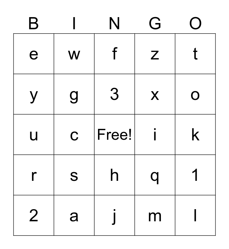 This bingo card has a free space and 30 words: a, b, c, d, e, f, g, h, i, j, k, l, m, n, o, p, q, r, s, t, u, v, w, x, y, z, 1, 2, 3 and 4.