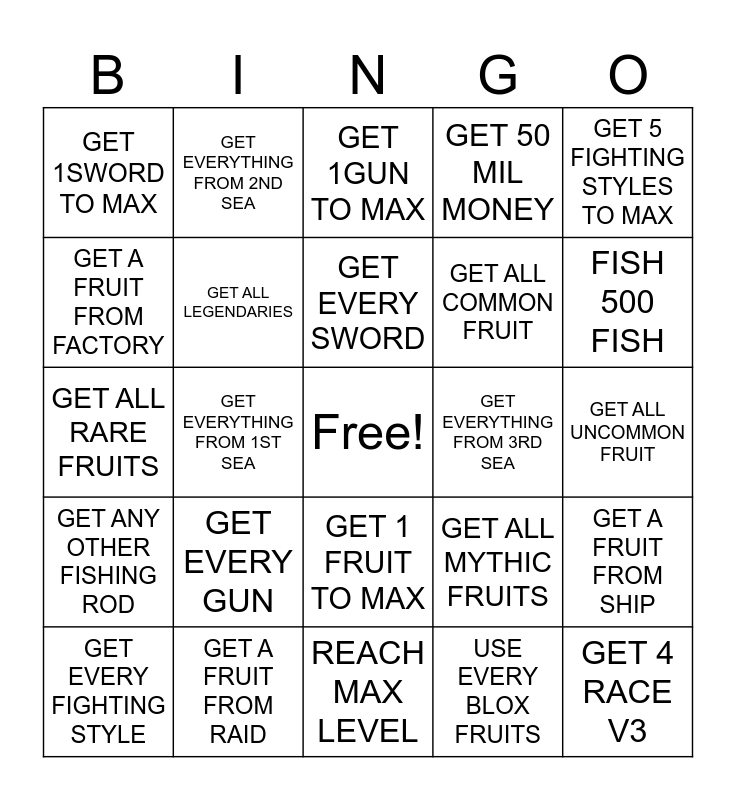 This bingo card has a free space and 24 words: GET EVERY FIGHTING STYLE, GET EVERY GUN, GET EVERY SWORD, USE EVERY BLOX FRUITS, GET 5 FIGHTING STYLES TO MAX, GET 1SWORD TO MAX, GET EVERYTHING FROM 2ND SEA, GET 1GUN TO MAX, GET EVERYTHING FROM 3RD SEA, GET ALL UNCOMMON FRUIT, GET ALL RARE FRUITS, GET ALL LEGENDARIES, GET ALL MYTHIC FRUITS, GET A FRUIT FROM SHIP, GET A FRUIT FROM FACTORY, GET A FRUIT FROM RAID, REACH MAX LEVEL, GET 50 MIL MONEY, FISH 500 FISH, GET ANY OTHER FISHING ROD, GET EVERYTHING FROM 1ST SEA, GET 1 FRUIT TO MAX, GET ALL COMMON FRUIT and GET 4 RACE V3.