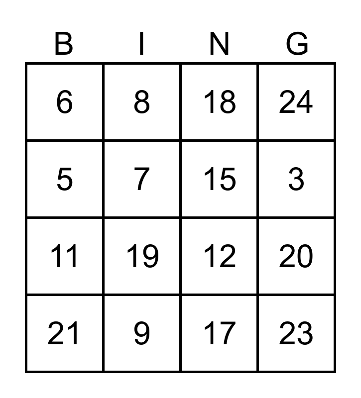 This bingo card has 25 words: 1, 2, 3, 4, 5, 6, 7, 8, 9, 10, 11, 12, 13, 14, 15, 16, 17, 18, 19, 20, 21, 22, 23, 24 and 25.