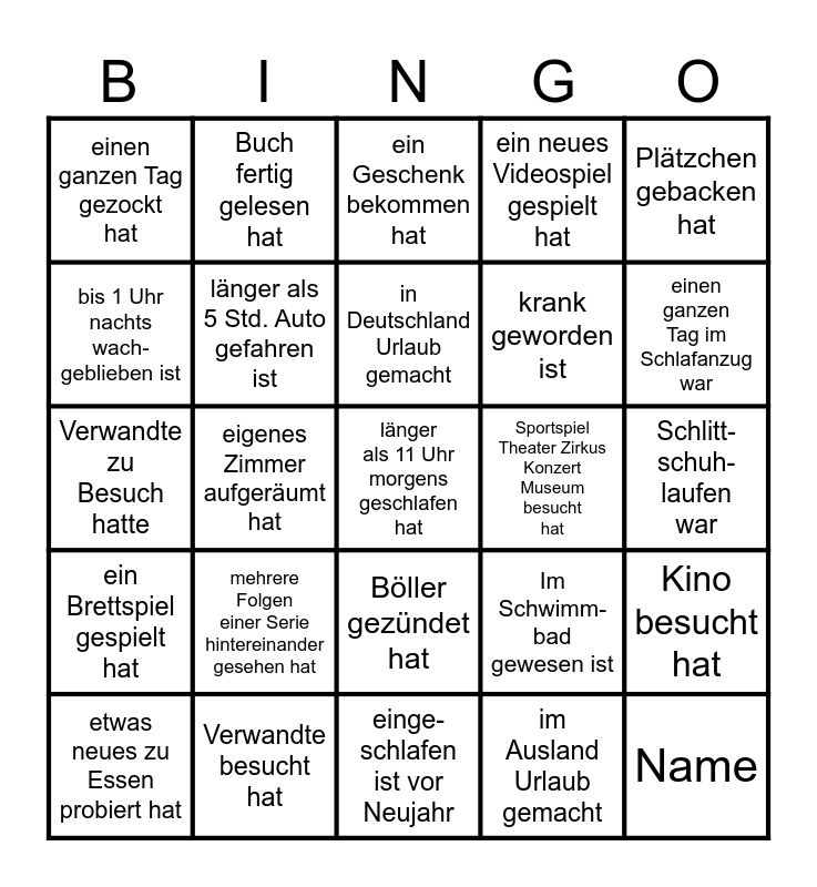 This bingo card has 26 words: Böller gezündet hat, im Ausland Urlaub gemacht, in Deutschland Urlaub gemacht, Verwandte besucht hat, Plätzchen gebacken hat, einen ganzen Tag gezockt hat, bis 1 Uhr nachts wach-geblieben ist, Buch fertig gelesen hat, Schlitt- schuh- laufen war, Im Schwimm-bad gewesen ist, krank geworden ist, Verwandte zu Besuch hatte, Kino besucht hat, etwas neues zu Essen probiert hat, eigenes Zimmer aufgeräumt hat, gewandert ist, ein neues Videospiel gespielt hat, ein Brettspiel gespielt hat, ein Geschenk bekommen hat, länger als 11 Uhr morgens geschlafen hat, einen ganzen Tag im Schlafanzug war, einge-schlafen ist vor Neujahr, Sportspiel Theater Zirkus Konzert Museum besucht hat, mehrere Folgen einer Serie hintereinander gesehen hat, länger als 5 Std. Auto gefahren ist and Name.