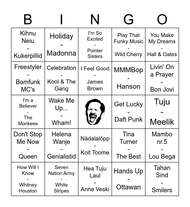 This bingo card has a free space and 34 words: Good Vibrations - Beach Boys, Hands Up - Ottawan, Dancing Queen - ABBA, Mr.Blue Sky - Electric Light Orchestra, Don't Stop Me Now - Queen, Celebration - Kool & The Gang, You Make My Dreams - Hall & Oates, How Will I Know - Whitney Houston, Holiday - Madonna, Praise You - Fatboy Slim, I Feel Good - James Brown, I'm So Excited - Pointer Sisters, Eye Of The Tiger - Survivor, Jump - Van Halen, Get Lucky - Daft Punk, Livin' On a Prayer - Bon Jovi, Seven Nation Army - White Stripes, I'm a Believer - The Monkees, Helena Wanje - Genialistid, Tina Turner - The Best, Nädalalõpp - Koit Toome, Satisfaction - Rolling Stones, Kihnu Neiu - Kukerpillid, Tuju - Meelik, Hea Tuju Laul - Anne Veski, Tahan Sind - Smilers, Play That Funky Music - Wild Cherry, Alright - Supergrass, MMMBop - Hanson, Freestyler - Bomfunk MC's, Cotton Eye Joe - Rednex, Wake Me Up... - Wham!, Mambo nr.5 - Lou Bega and Kid's Stuff Rock - Röövel Ööbik.