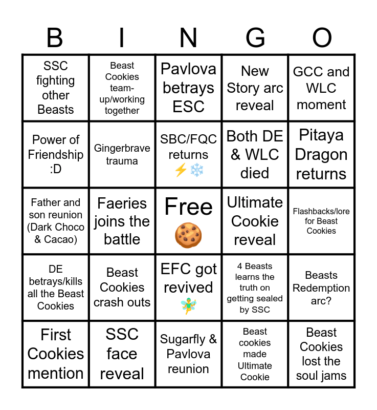 This bingo card has a free space and 24 words: Beast Cookies crash outs, SSC face reveal, SBC/FQC returns ⚡️❄️, First Cookies mention, GCC and WLC moment, SSC fighting other Beasts, Power of Friendship :D, Beast Cookies team-up/working together, Ultimate Cookie reveal, EFC got revived 🧚♂️, Both DE & WLC died, Father and son reunion (Dark Choco & Cacao), 4 Beasts learns the truth on getting sealed by SSC, Beasts Redemption arc?, Gingerbrave trauma, Beast cookies made Ultimate Cookie, Flashbacks/lore for Beast Cookies, Pavlova betrays ESC, Pitaya Dragon returns, Faeries joins the battle, Beast Cookies lost the soul jams, DE betrays/kills all the Beast Cookies, New Story arc reveal and Sugarfly & Pavlova reunion.