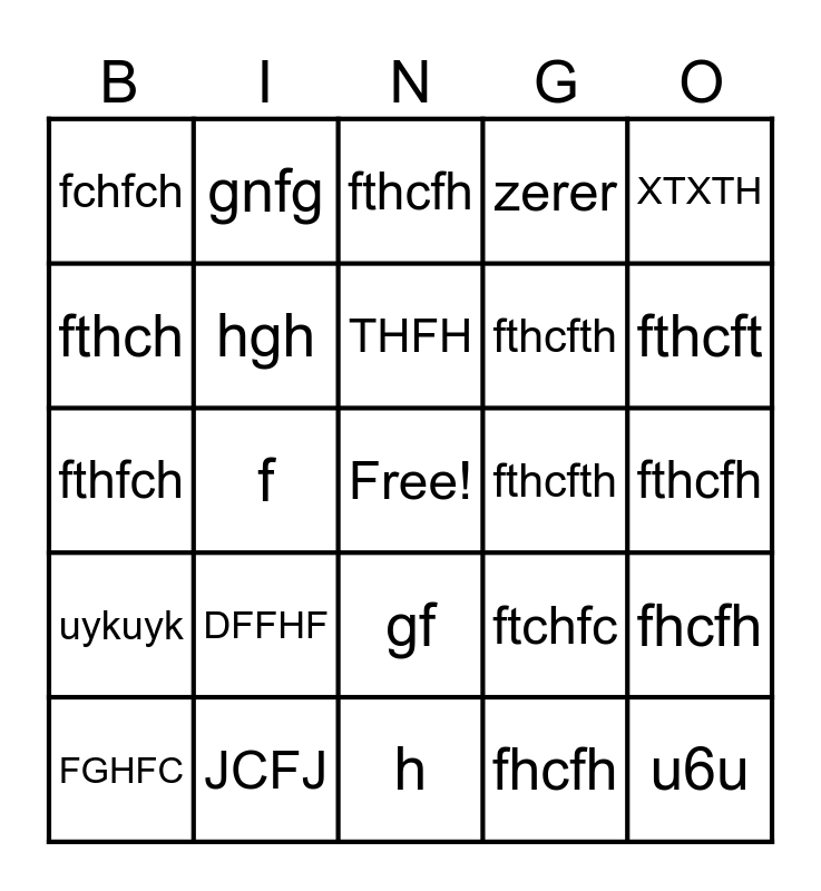 This bingo card has a free space and 24 words: DFFHF, JCFJ, THFH, FGHFC, XTXTH, fchfch, fthch, gnfg, fthcfth, gf, fthcfth, fthfch, ftchfc, fhcfh, hgh, fhcfh, fthcfh, fthcfh, fthcft, f, u6u, uykuyk, zerer and h.
