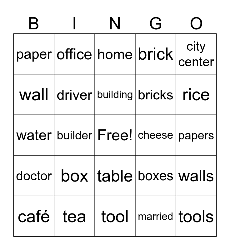 This bingo card has a free space and 33 words: delivery driver, receptionist, builder, teacher, doctor, driver, city center, café, office, shop, building, home, sandwich, bread, cheese, rice, tea, water, box, boxes, table, money, paper, papers, tool, tools, brick, bricks, wall, walls, address, married and single.