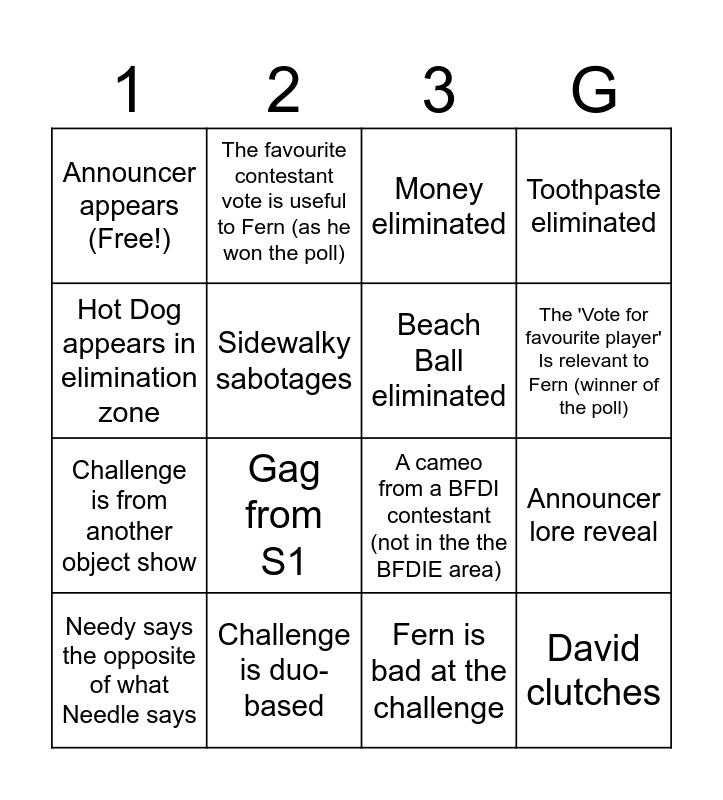 This bingo card has 16 words: Needy says the opposite of what Needle says, Challenge is duo-based, Money eliminated, Toothpaste eliminated, Hot Dog appears in elimination zone, The favourite contestant vote is useful to Fern (as he won the poll), A cameo from a BFDI contestant (not in the the BFDIE area), Announcer lore reveal, Announcer appears (Free!), Sidewalky sabotages, Fern is bad at the challenge, The 'Vote for favourite player' Is relevant to Fern (winner of the poll), Challenge is from another object show, Gag from S1, Beach Ball eliminated and David clutches.