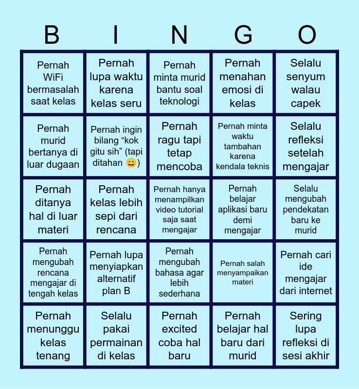 This bingo card has 25 words: Pernah mengubah rencana mengajar di tengah kelas, Selalu pakai permainan di kelas, Pernah hanya menampilkan video tutorial saja saat mengajar, Pernah belajar hal baru dari murid, Selalu senyum walau capek, Pernah WiFi bermasalah saat kelas, Pernah lupa waktu karena kelas seru, Pernah minta murid bantu soal teknologi, Pernah belajar aplikasi baru demi mengajar, Pernah cari ide mengajar dari internet, Pernah murid bertanya di luar dugaan, Pernah ingin bilang “kok gitu sih” (tapi ditahan 😄), Pernah excited coba hal baru, Pernah salah menyampaikan materi, Selalu refleksi setelah mengajar, Pernah menunggu kelas tenang, Pernah kelas lebih sepi dari rencana, Pernah ragu tapi tetap mencoba, Pernah minta waktu tambahan karena kendala teknis, Selalu mengubah pendekatan baru ke murid, Pernah ditanya hal di luar materi, Pernah lupa menyiapkan alternatif plan B, Pernah mengubah bahasa agar lebih sederhana, Pernah menahan emosi di kelas and Sering lupa refleksi di sesi akhir.