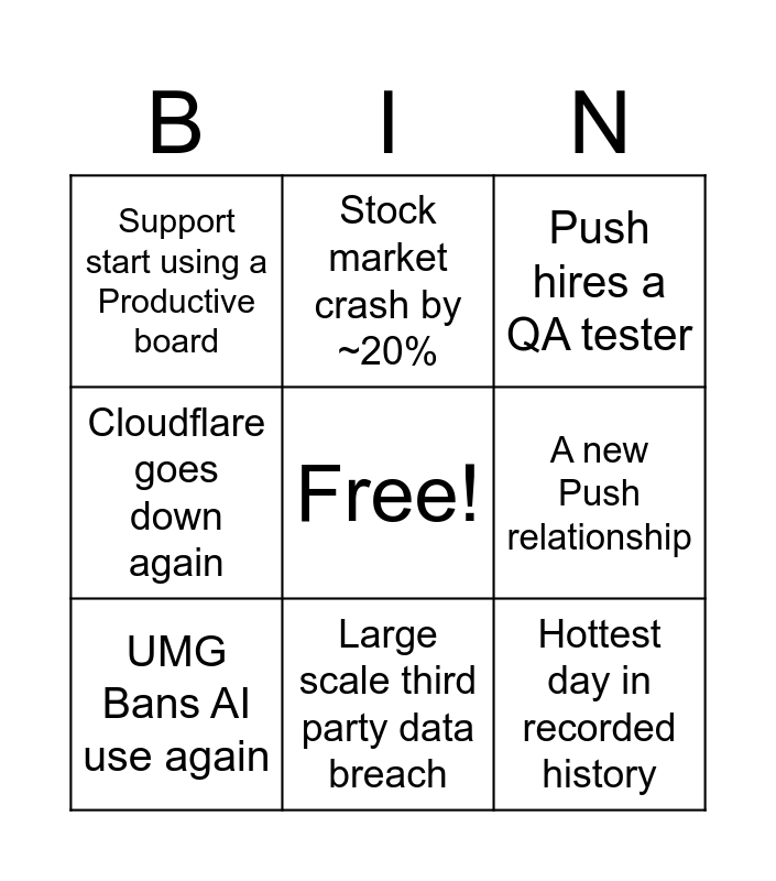 This bingo card has a free space and 8 words: A new Push relationship, Push hires a QA tester, Stock market crash by ~20%, UMG Bans AI use again, Support start using a Productive board, Hottest day in recorded history, Cloudflare goes down again and Large scale third party data breach.