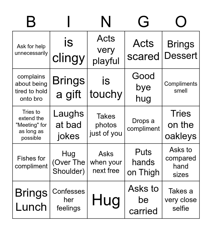 This bingo card has 25 words: Hug (Over The Shoulder), Hug, is touchy, Brings Lunch, Brings Dessert, Ask for help unnecessarily, complains about being tired to hold onto bro, is clingy, Drops a compliment, Asks when your next free, Good bye hug, Tries to extend the "Meeting" for as long as possible, Puts hands on Thigh, Asks to compared hand sizes, Brings a gift, Takes a very close selfie, Tries on the oakleys, Acts very playful, Compliments smell, Laughs at bad jokes, Takes photos just of you, Confesses her feelings, Fishes for compliment, Acts scared and Asks to be carried.