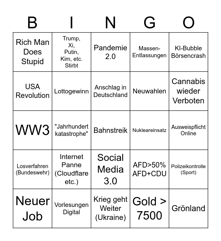 This bingo card has a free space and 24 words: Internet Panne (Cloudflare etc.), Vorlesungen Digital, Anschlag in Deutschland, Neuer Job, KI-Bubble Börsencrash, Rich Man Does Stupid, USA Revolution, Trump, Xi, Putin, Kim, etc. Stirbt, Nukleareinsatz, Social Media 3.0, Neuwahlen, WW3, AFD>50% AFD+CDU, Polizeikontrolle (Sport), Lottogewinn, Gold > 7500, Ausweispflicht Online, Pandemie 2.0, Cannabis wieder Verboten, "Jahrhundert katastrophe", Grönland, Losverfahren (Bundeswehr), Massen-Entlassungen and Krieg geht Weiter (Ukraine).